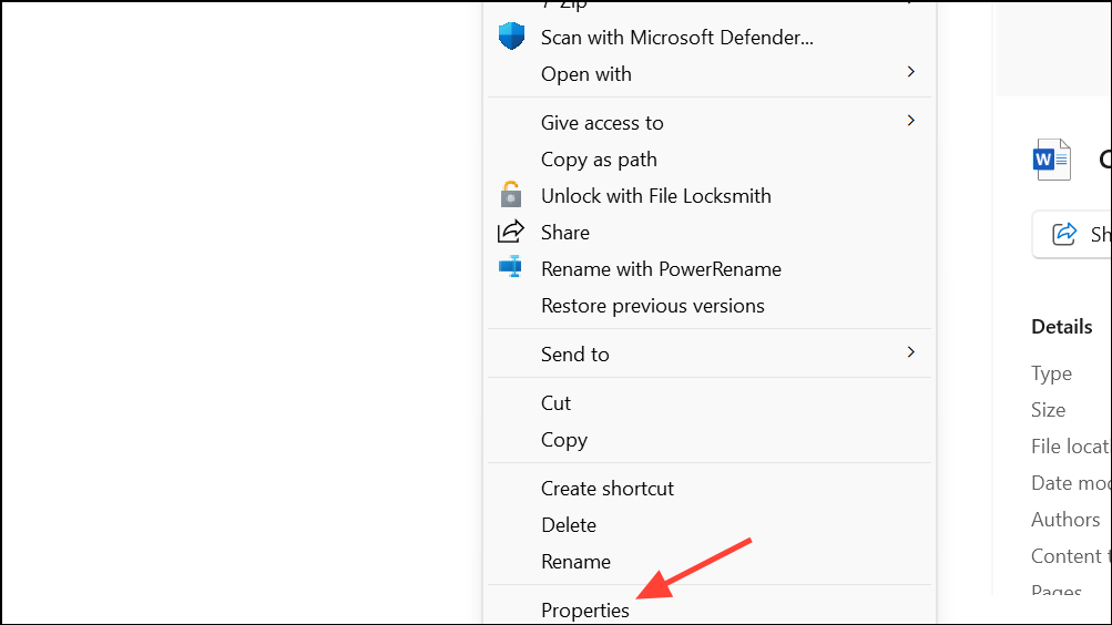 Step 1: Locate the problematic Word document in Windows File Explorer. Right-click the file and select Properties.
