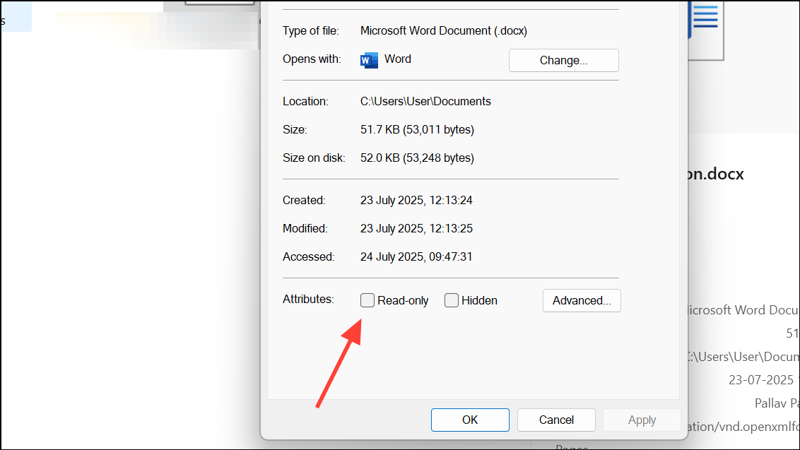Step 2: In the Properties window, look for the "Read-only" attribute under the General tab. If it's checked, uncheck it and click Apply, then OK.