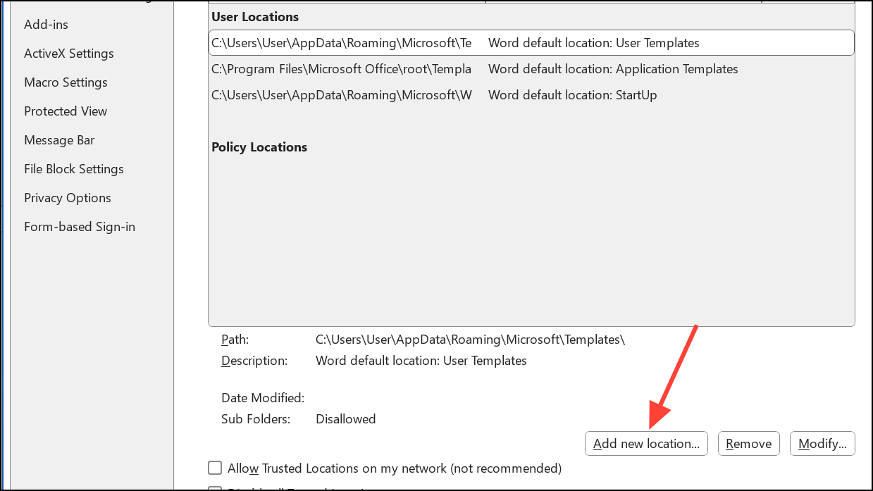 Step 2: Select Trusted Locations on the left. Click Add new location and browse to the folder where your documents are stored—this could be a local folder, network share, or cloud sync directory (like OneDrive or Dropbox).