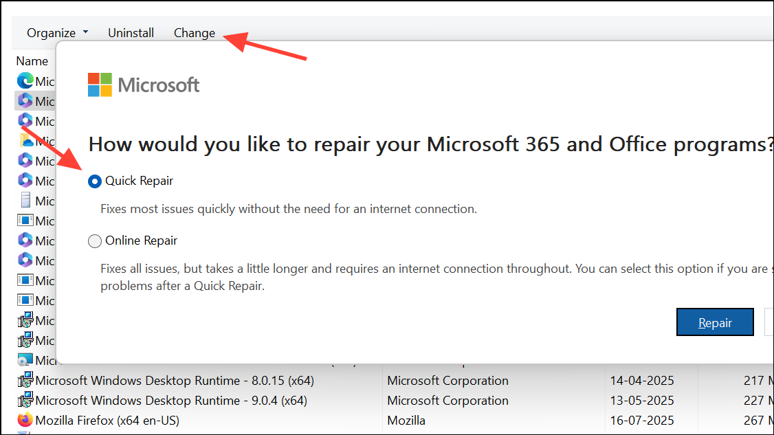 Step 2: Choose Change, then select Quick Repair or Online Repair. This process fixes issues with Office applications that can trigger read-only mode unexpectedly.