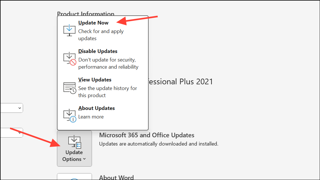 Step 3: After the repair, restart your computer and check for Office updates via File > Account > Update Options in Word.