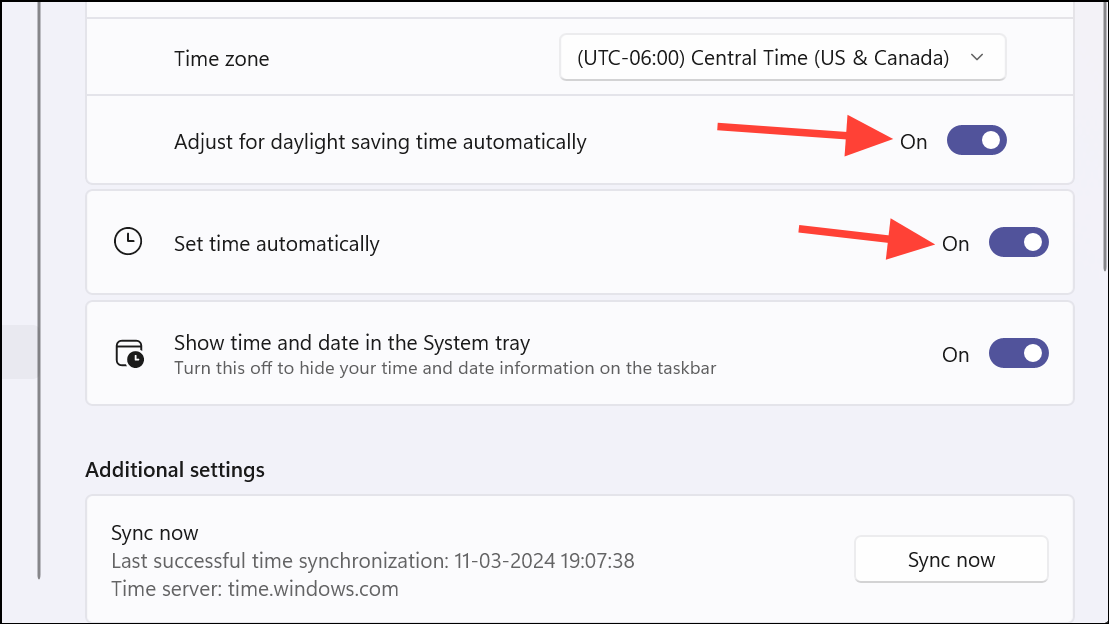 Step 4: Make sure the toggles for Set time automatically and Adjust for daylight saving time automatically are turned on.