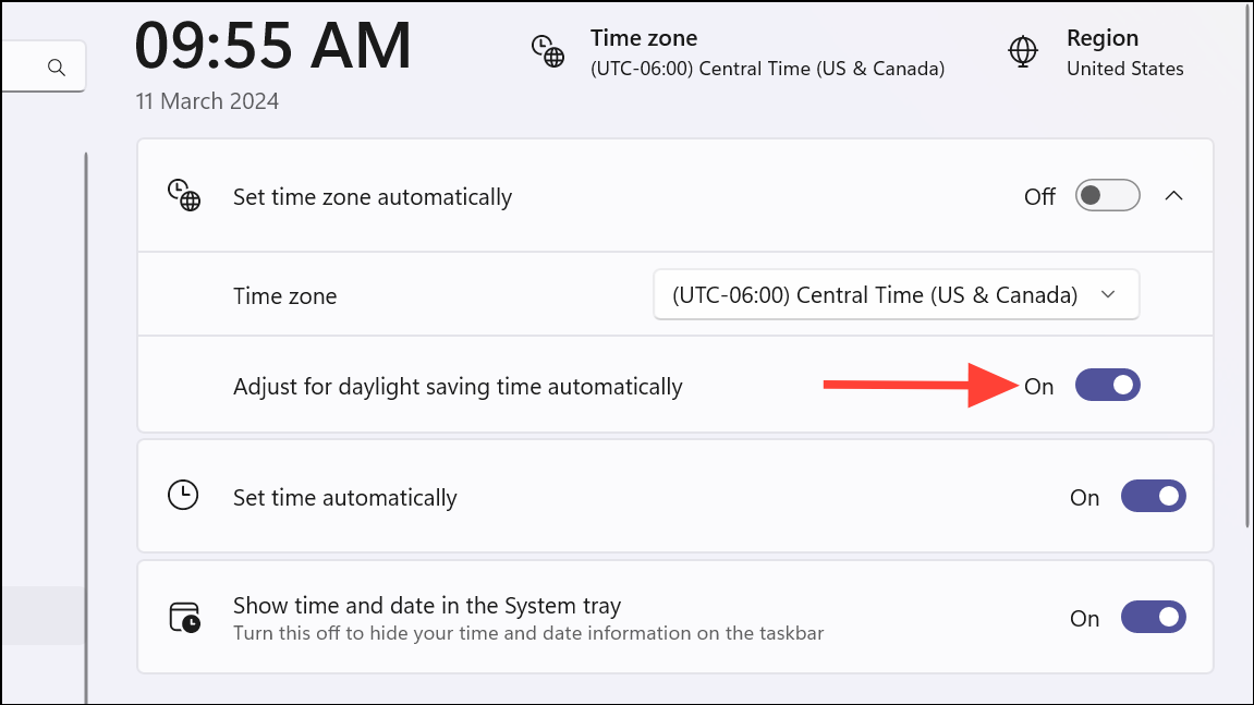 Enable the setting for daylight saving time in Windows 11