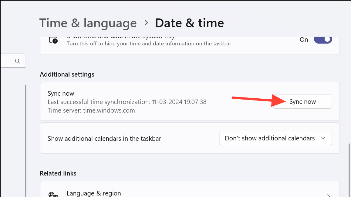 Step 3: If it hasn't synced recently, click on Sync now to update your system time.