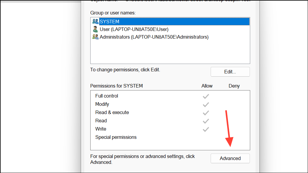 Step 2: Go to the Security tab and click Advanced.
