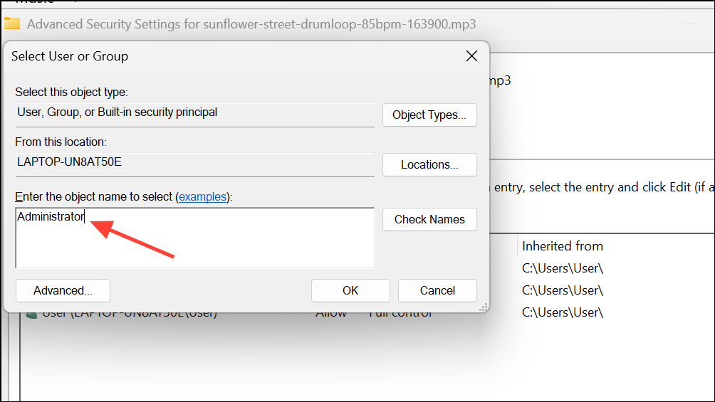 Step 3: Click Change next to the Owner field. Type Administrator or your user name, then click OK.