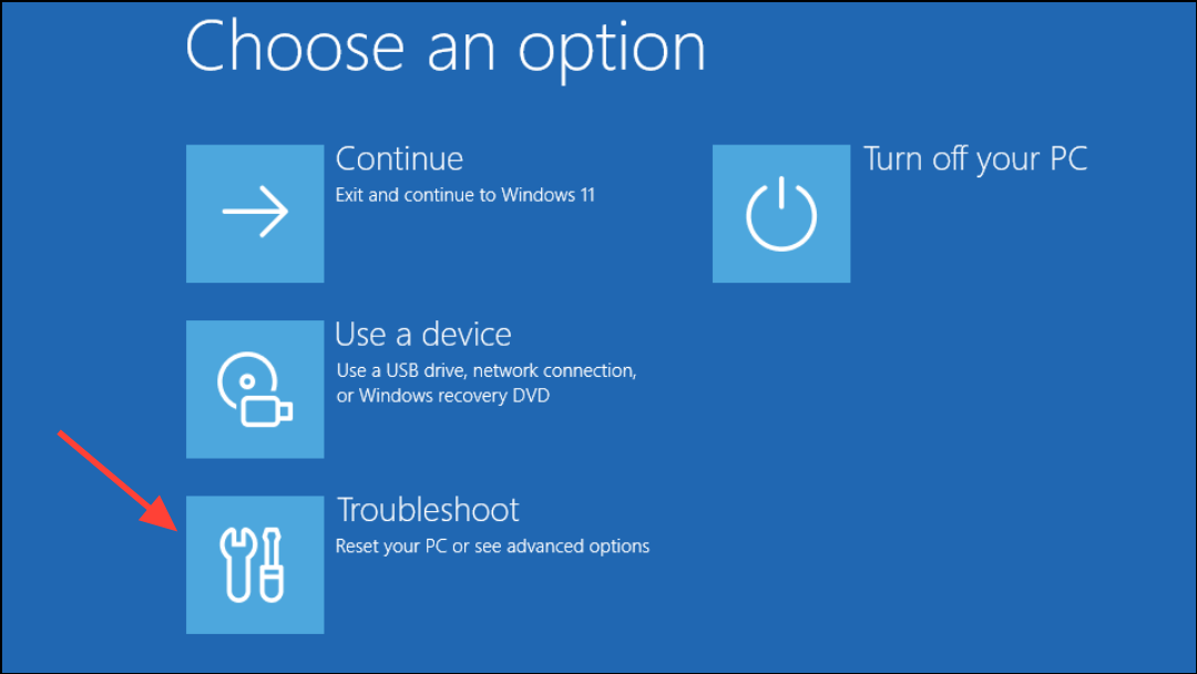 Step 2: In the Recovery Environment, select Troubleshoot, then click on Advanced options.