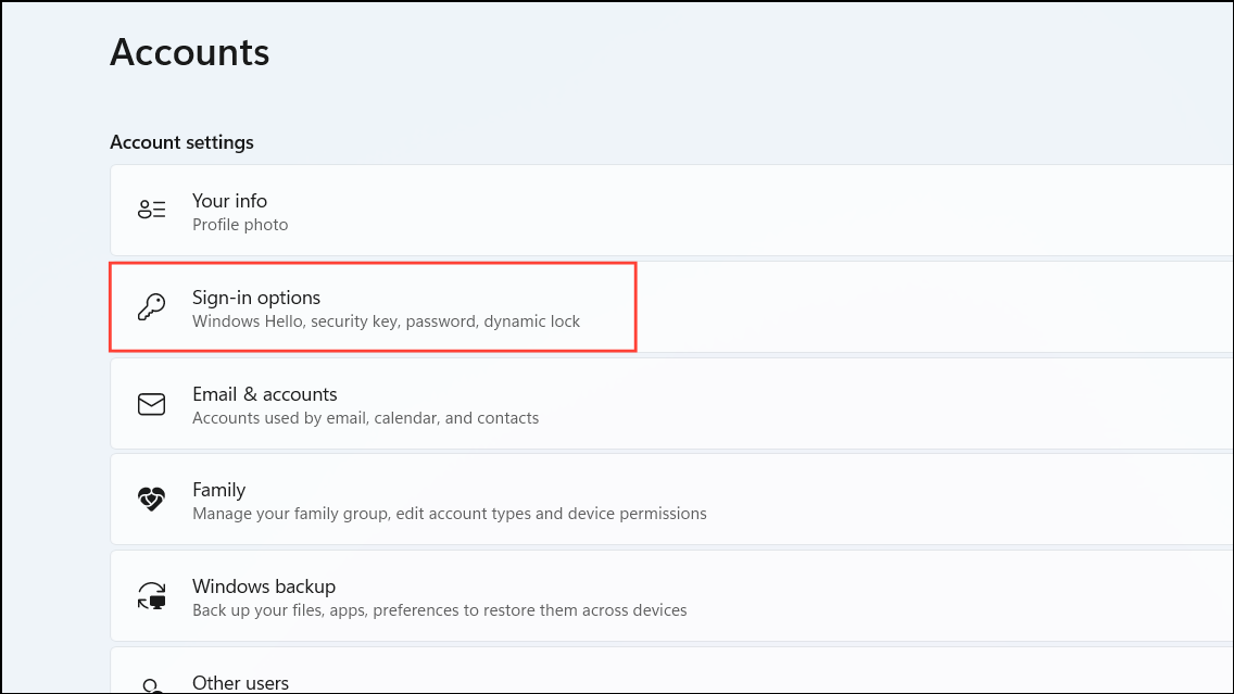 Step 5: Navigate to Accounts on the left pane, then click on Sign-in options on the right.