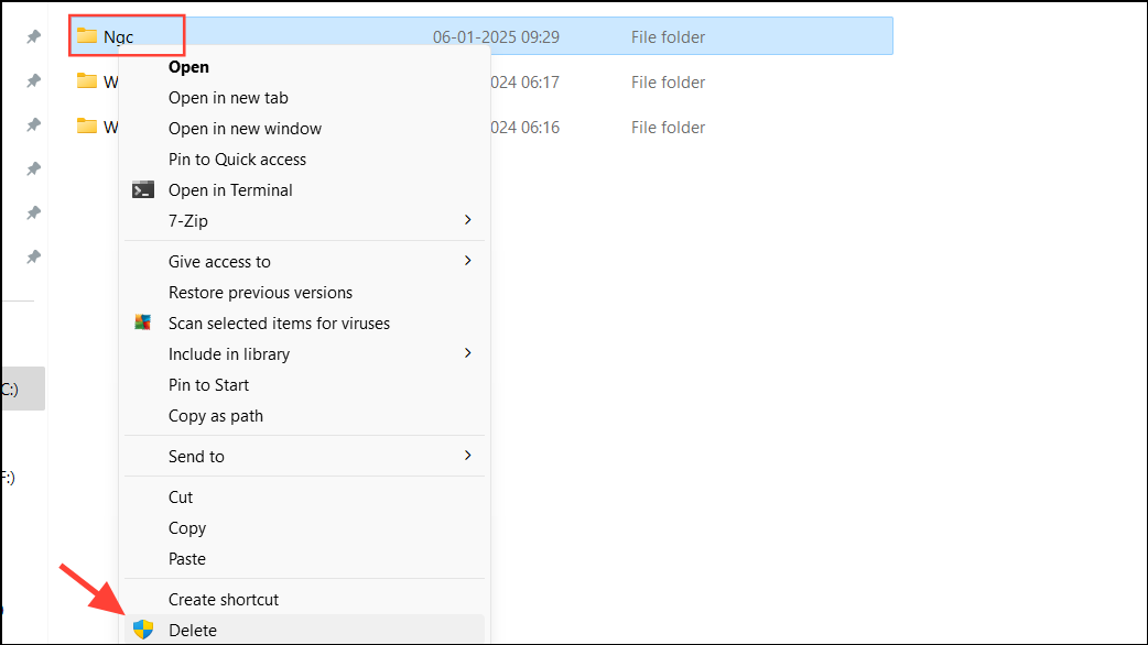 Step 7: Locate the Ngc folder, right-click on it, and select Delete.