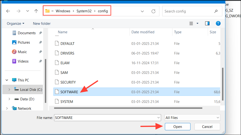 Step 7: Navigate to C:\Windows\System32\config, select the Software file, and click Open.