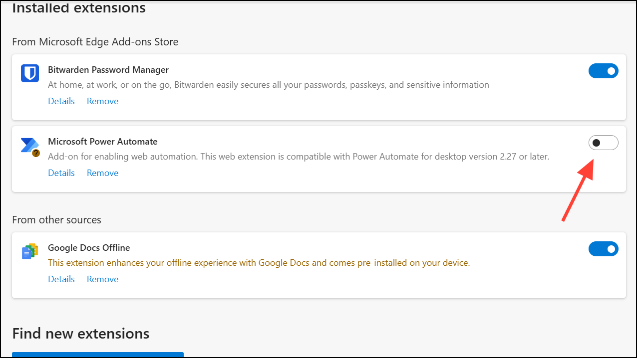 Step 3: In your main Edge window, type edge://extensions/ in the address bar and press Enter. Disable all extensions by toggling them off.