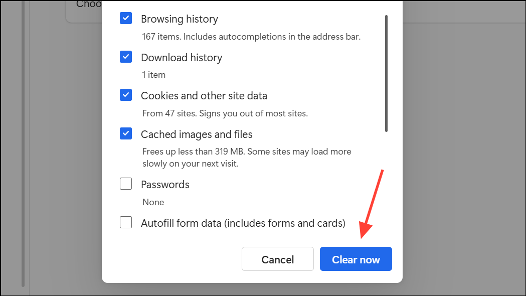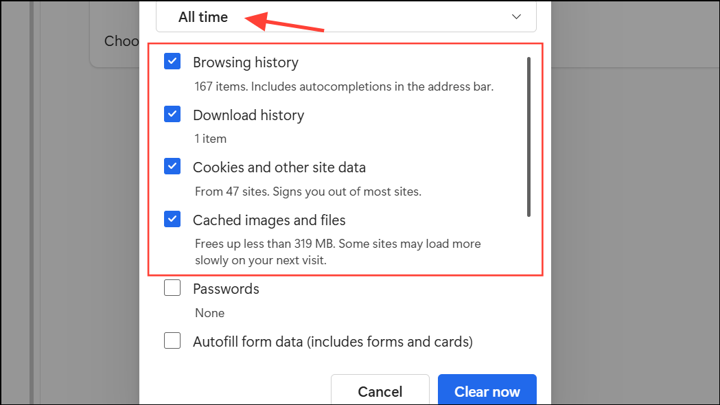 Step 4: Set Time range to All time. Check Cached images and files and Cookies and other site data. Leave Passwords unchecked unless you want to remove saved logins.