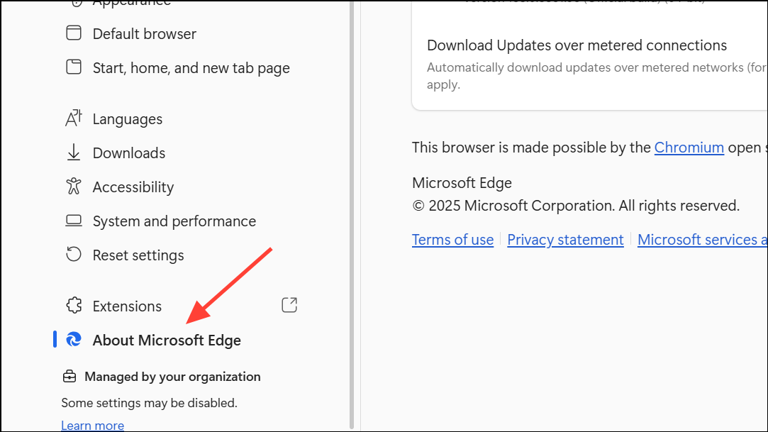 Step 2: In the sidebar, choose About Microsoft Edge. Edge will automatically check for and install updates.