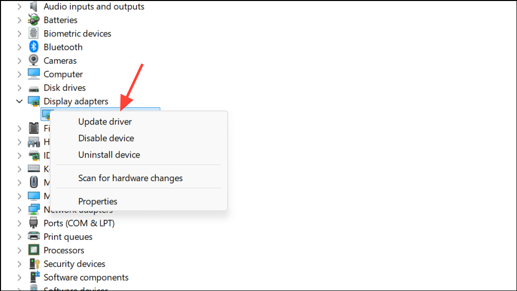 Step 2: Expand Display adapters, right-click your graphics device, and select Update driver.