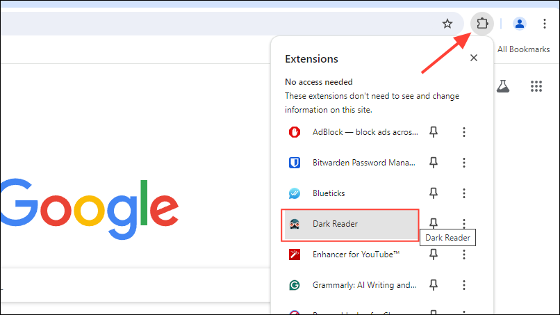 - Once the extension is installed, click on the Extensions button next to the address bar and then on the Dark Reader extension.