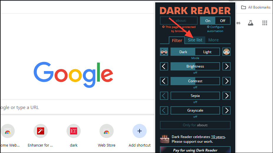 - You can also adjust other dark mode settings in the extension, such as the brightness and contrast, and even turn on grayscale and sepia. You can even turn on these settings for specific sites using the 'Site list' option.