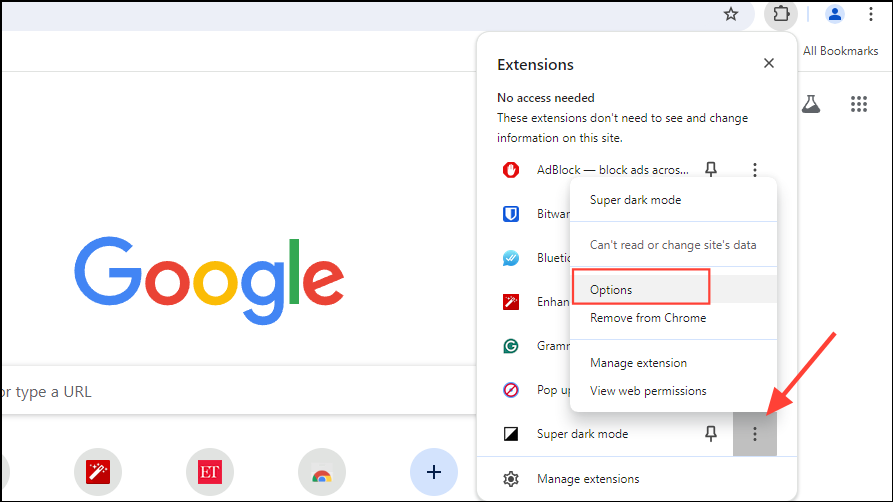 - To configure various settings of the extension, click on the three dots next to the extension and then on 'Options'.