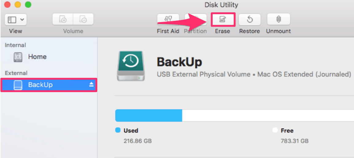 Once it loads up, it’ll show you the list of drives that are connected to your Mac. Your external drive should show up on the left panel under the ‘External’ section, select it and then click on the ‘Erase’ button on the top to format the drive.