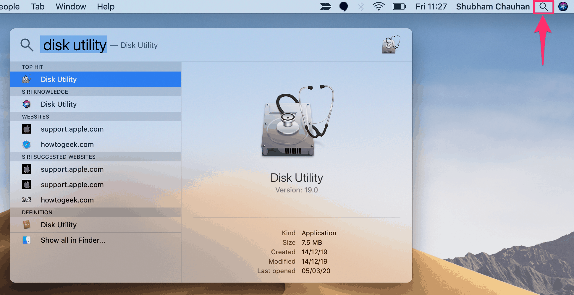 Connect the external drive to the Mac via USB or Thunderbolt port. Next, you need to go to Disk Utility. The quickest way to do this is a Spotlight search. Press Command + Space Bar on your keyboard, type ‘Disk Utility’ and hit the return key. You can also use the search button at the top left corner.