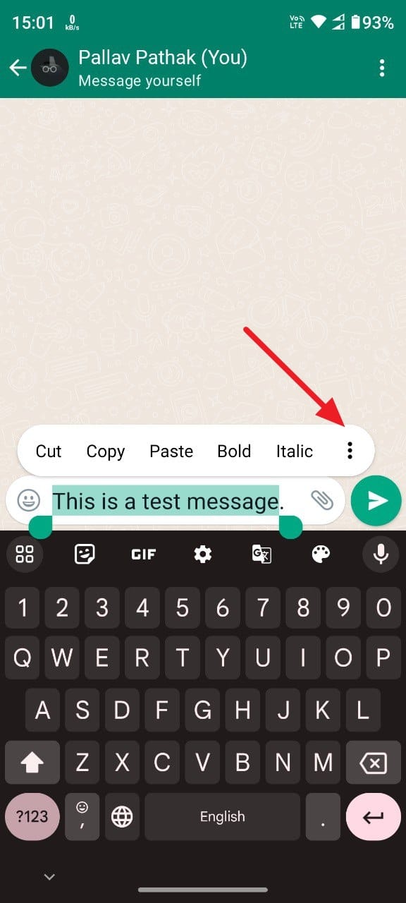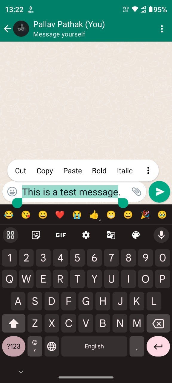 - Once the message is selected, you will see a few options appear above it, such as 'Cut', 'Copy', 'Paste', etc. There will also be two formatting options, 'Bold' and 'Italic'.