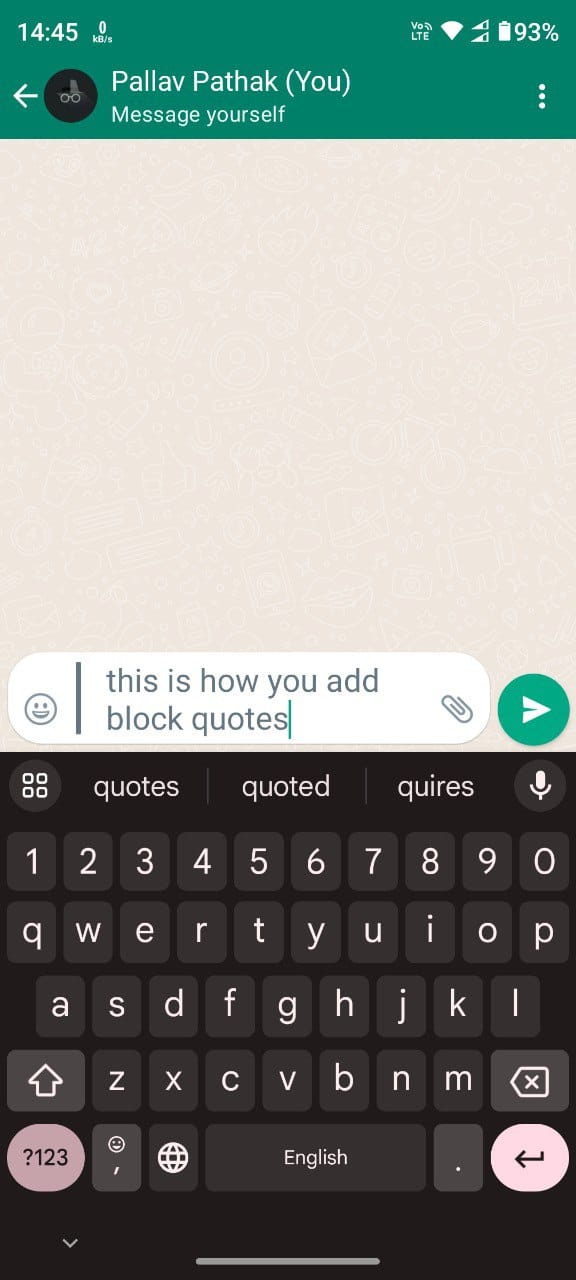 - Whatsapp also allows adding block quotes to highlight pieces of text in the message. Just type