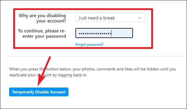 The screen to disable your account will appear. Select a reason from the drop-down menu for disabling your account and enter your password. As soon as you complete both the steps, the button to ‘Temporarily Disable Account’ will become clickable; click on it to finish the process.