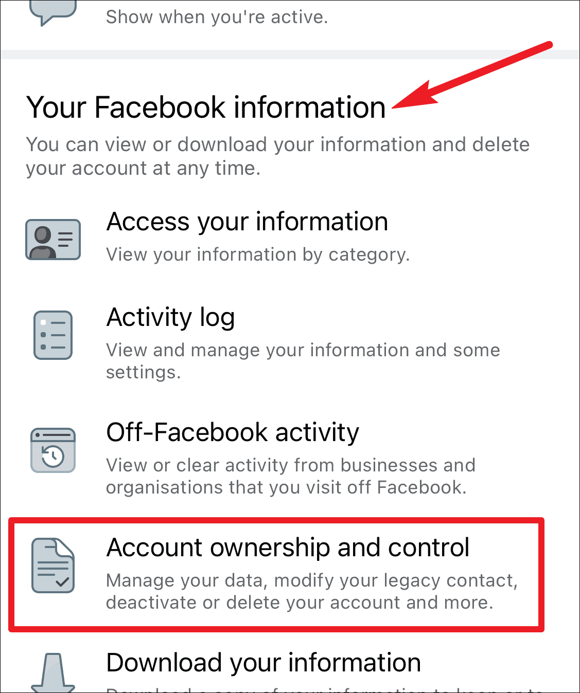 In settings, scroll down until you find the section for ‘Your Facebook Information’. Then, tap on the ‘Account ownership and control’ option.
