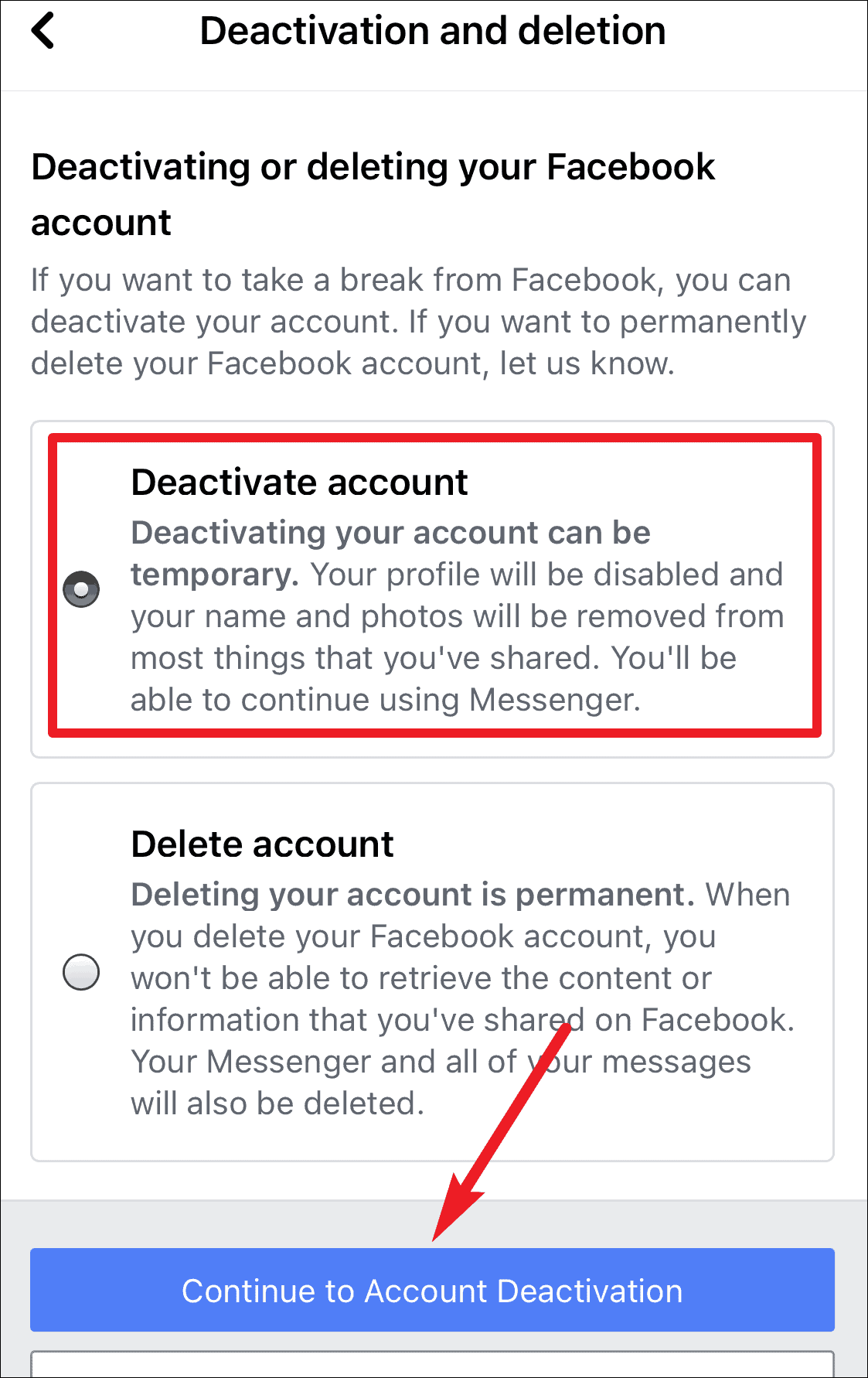 The ‘Deactivate account’ option should be selected by default. If it isn’t, select it. Selecting the other option ‘Delete account’ will permanently delete your account. Then, tap on ‘Continue to Account Deactivation’.