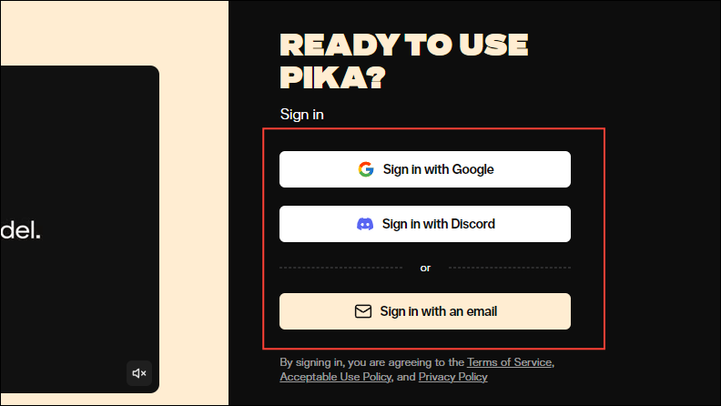 - First, visit the Pika Labs website and sign in using your Google or Discord account or sign up with your email.