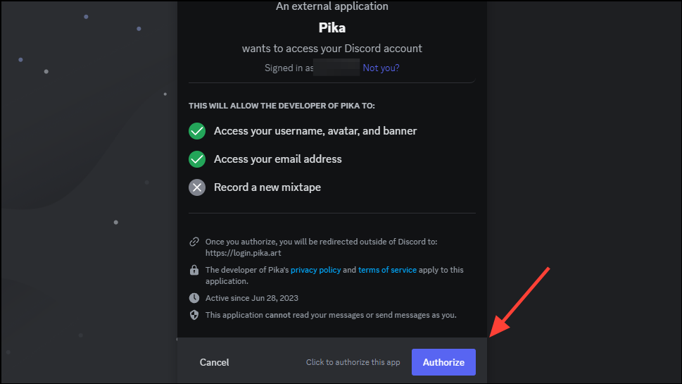 - You will need to authorize Pika before it can access information from your Google, Discord, or other email account.