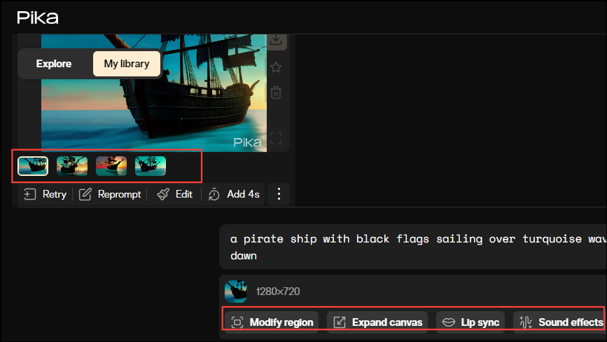 - When you click on the 'Edit' button, you will get a few variations of the generated video you can choose from. Click on any of the variants to select it. You can also modify a specific region of the video, expand the canvas, and add sound effects using the provided buttons.
