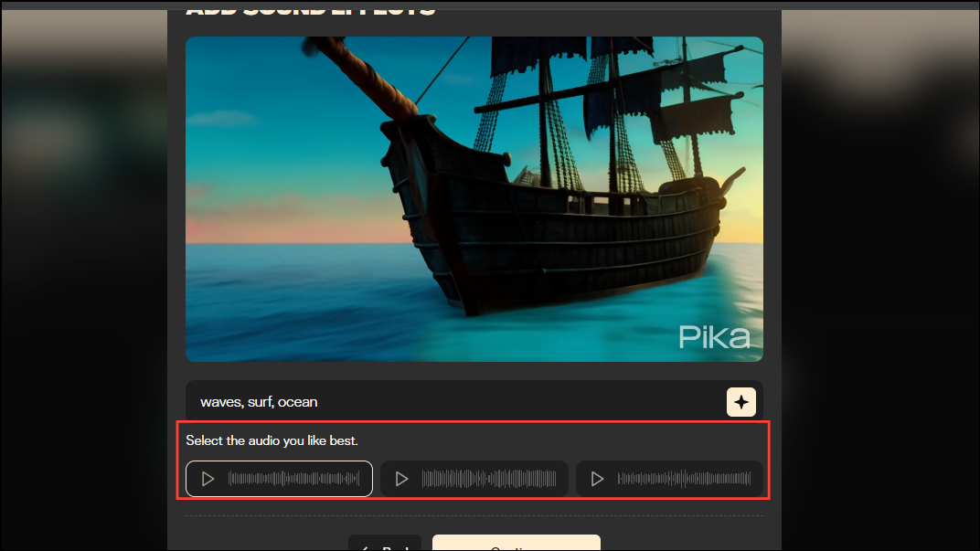 - When the AI completes generating the sounds, you will get three options. You can click on each one to listen to it and then select the one you like the most.