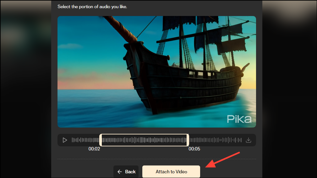 - Next, you need to select a section of the audio for your video. Drag the selector to the section you want to attach to the video, then click on 'Attach to video'.