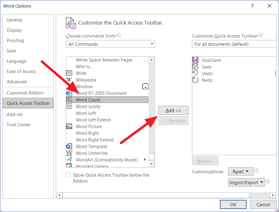 Next, scroll down the list of commands and locate the ‘Word Count’ command. Then, select the ‘Word Count’ command and click ‘Add’ in the middle.