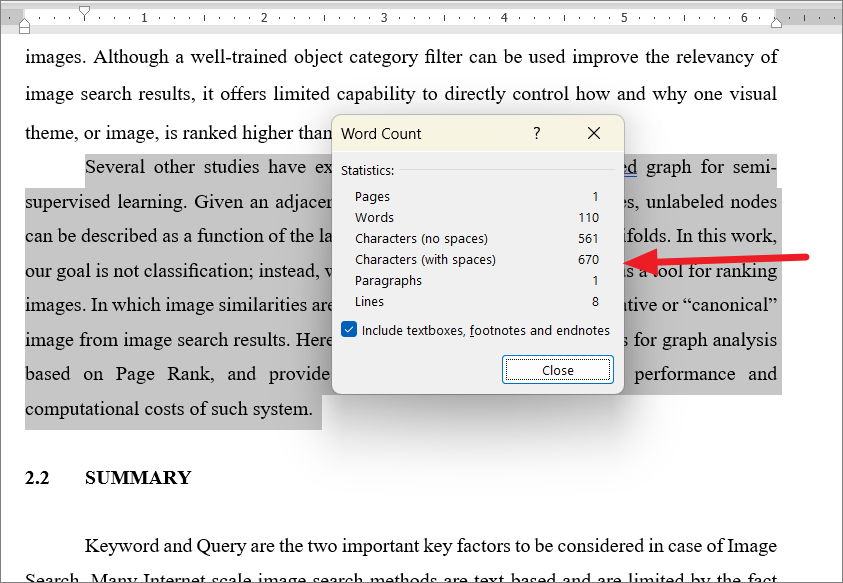 At the bottom of the text, check the ‘Include textboxes, footnotes, and endnotes’ option if you also want the text boxes, footnotes, and endnotes to be included in the count. When you are done, click the ‘Close’ button to close the dialog box.