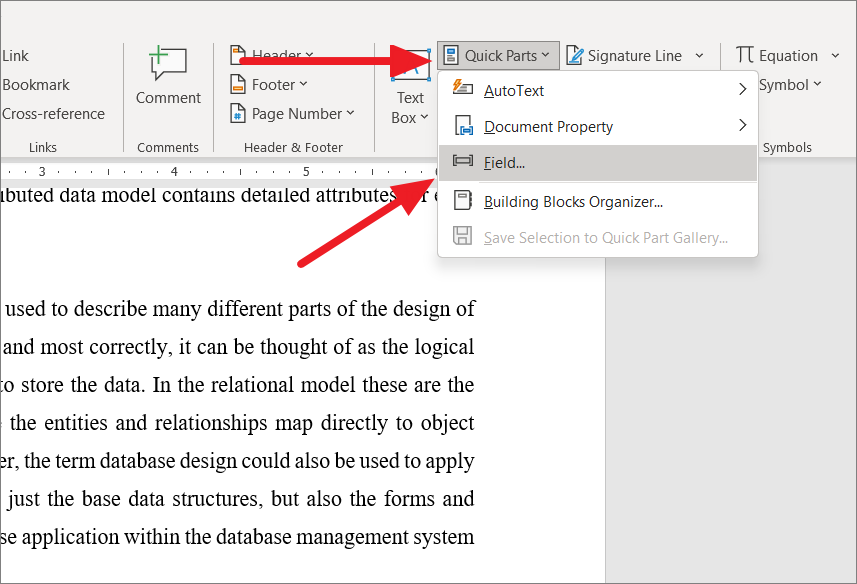 In the Insert tab, click on the ‘Quick Parts’ button from the Text section, and select the ‘Field’ option.