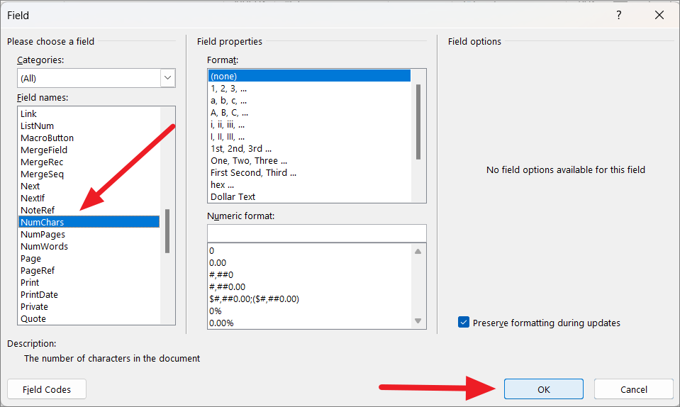 This will open up the Field dialog box. In the Field names list, select the ‘NumChars’ option and click on the ‘OK’ button. If you want the number of words instead, select ‘NumWords’ from the Field names list and click ‘OK’.