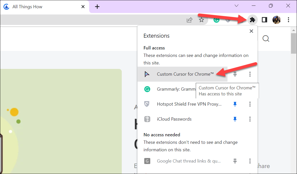 Then, click the ‘Extensions’ icon from the right of the address bar and click the ‘Custom Cursor for Chrome’ extension. You can also pin the extension to the address bar by clicking the ‘Pin’ icon from the menu.