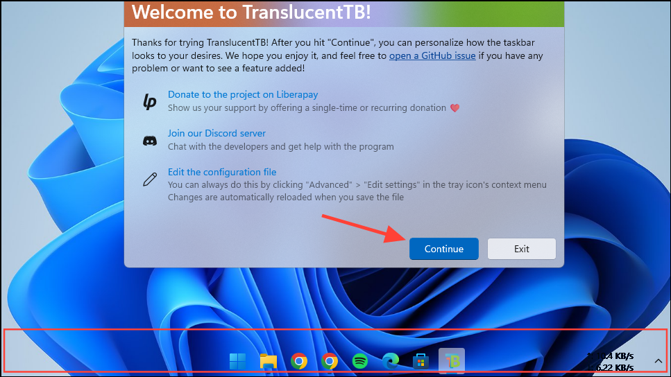 - You will see your taskbar has become completely transparent and the application will appear on your desktop. Click on the 'Continue' button.