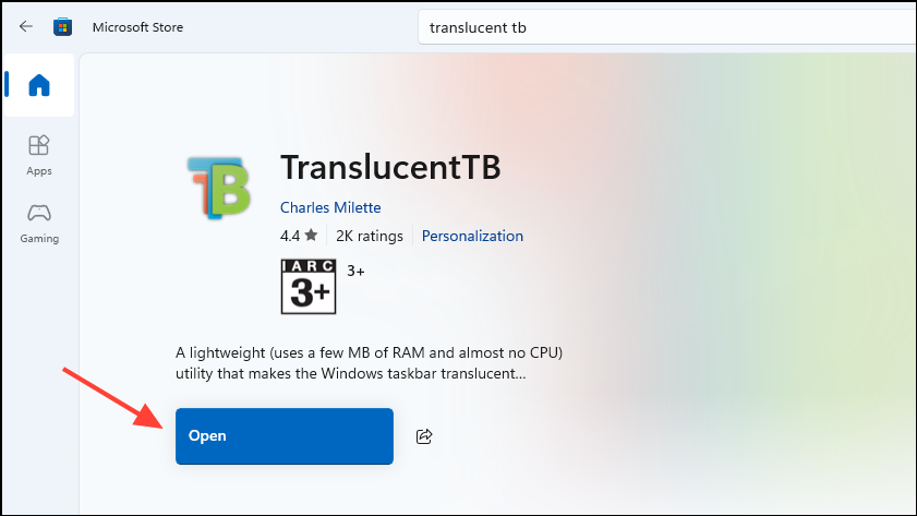 - Open the Microsoft Store from the Start menu and install TranslucentTB.
