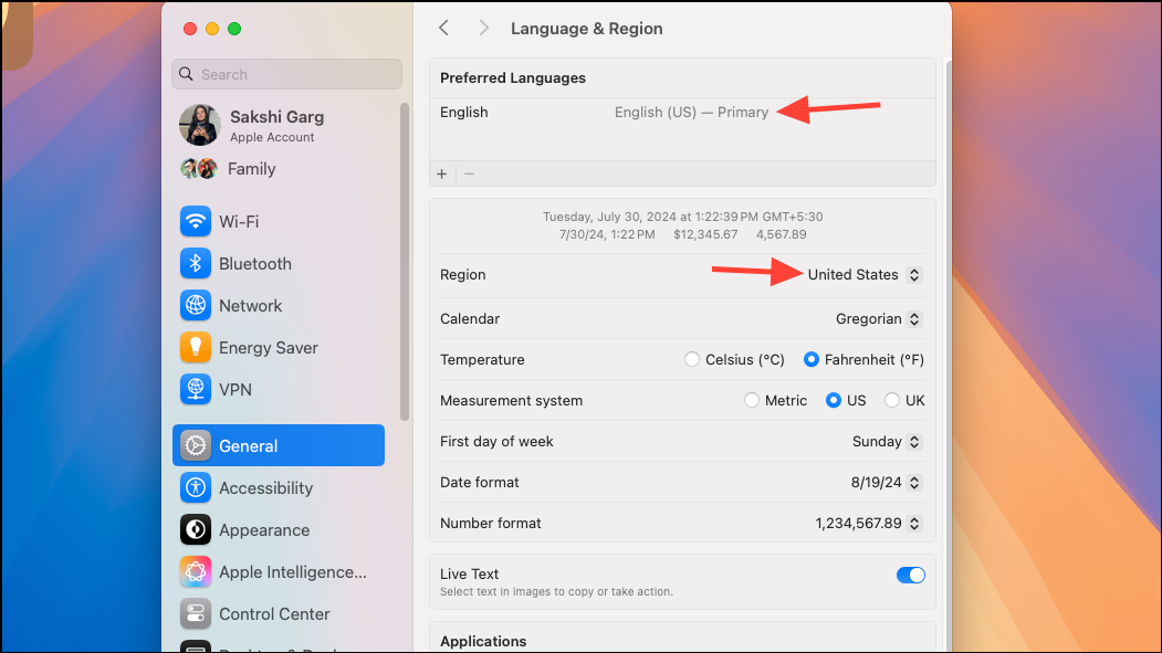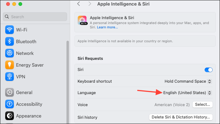 - If you see that Apple Intelligence isn't available in your region, change the Siri and device language to US English and set the device region to the United States. Change the Siri language from the Apple Intelligence menu.
