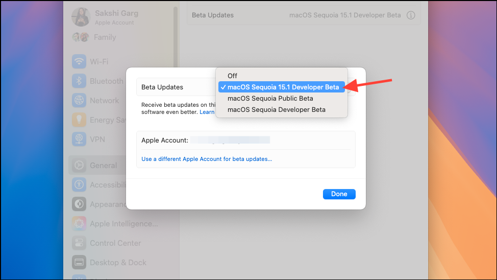 General>Software Update>Beta Updates. - Then, select iOS 18.1 Developer Beta/ macOS Sequoia 15.1 Developer Beta from the menu and install the update.