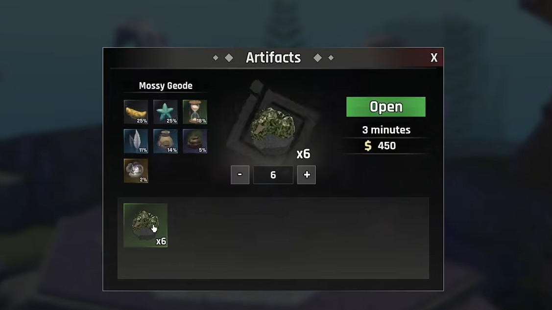 Each Geode requires a certain amount of in-game currency and a wait time before it opens. The cost and duration vary by Geode type. After you accept the prompt, the timer begins. When it expires, you receive one random Artifact from that Geode's loot pool.