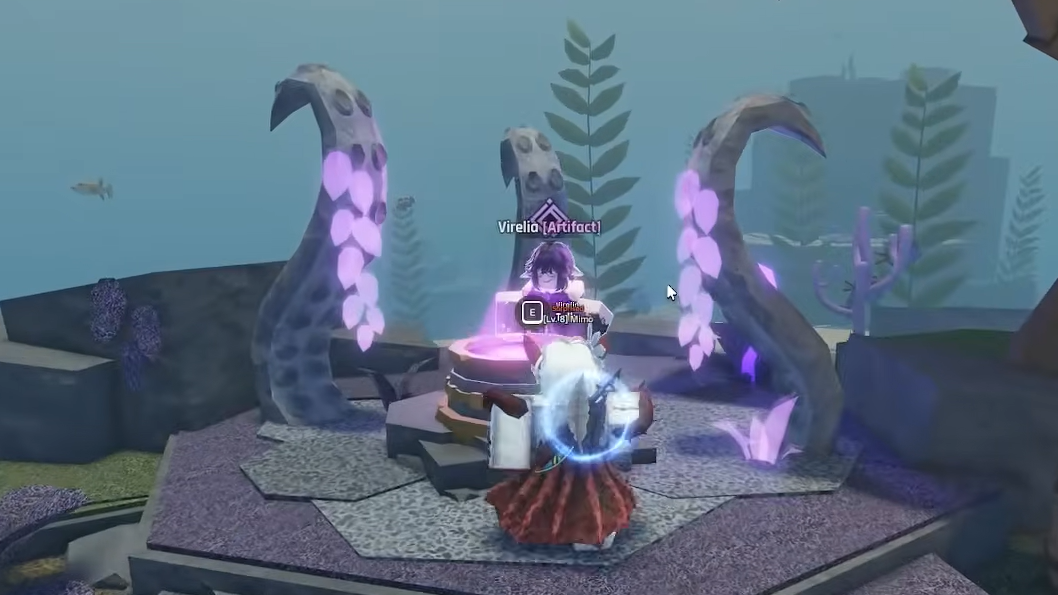 Once you have a Geode, travel to the starting island and locate Virelia in the purple-lit area near the kraken. Interact with her and select the "Yes (Open Artifacts)" option. A menu will display your Geodes — choose the one you want to open and confirm.