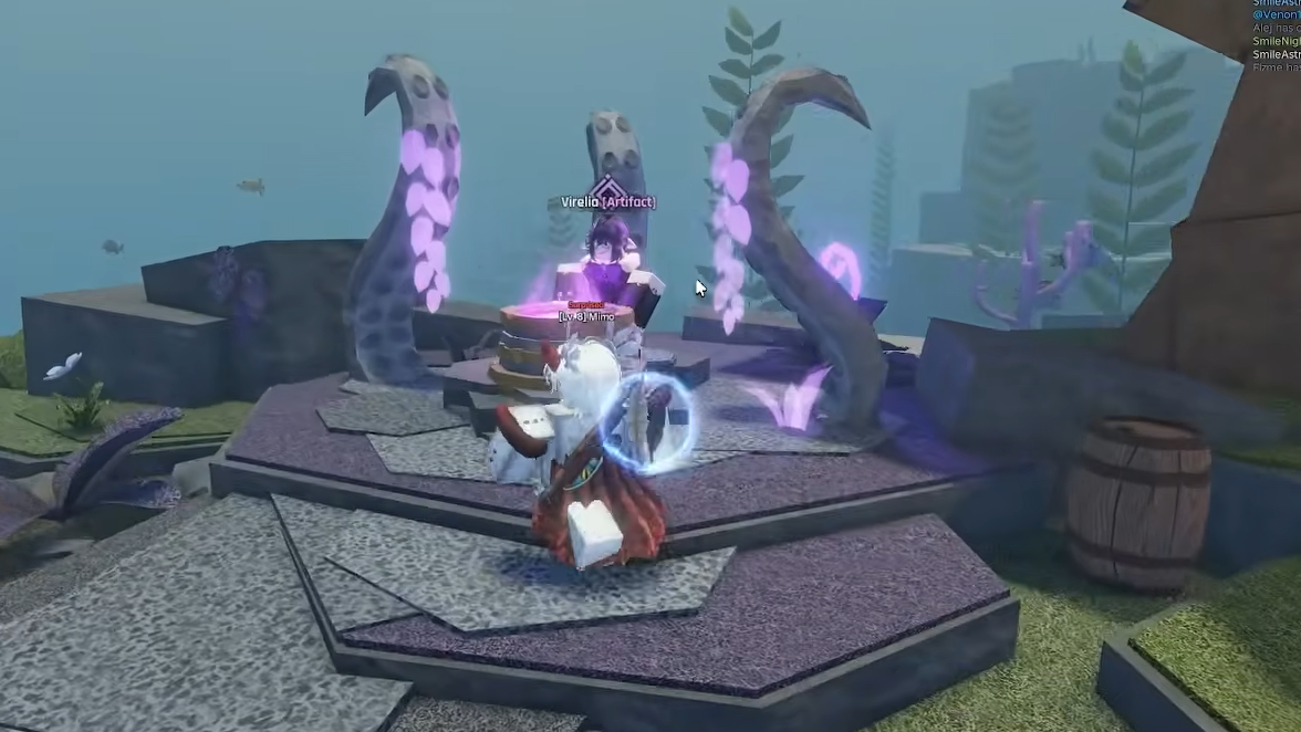 Virelia is the purple-haired NPC located near the Tubes Shop at Forgotten Deep. She is surrounded by white octopus legs and a circular table that emits a purple glow. Interact with her to access the Geode opening menu.