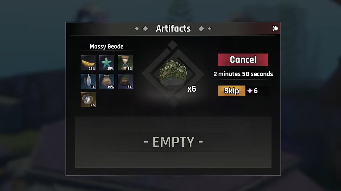 Step 4: Confirm the transaction and wait for the timer to complete. Once finished, you will receive a random Artifact from the Geode's loot pool.