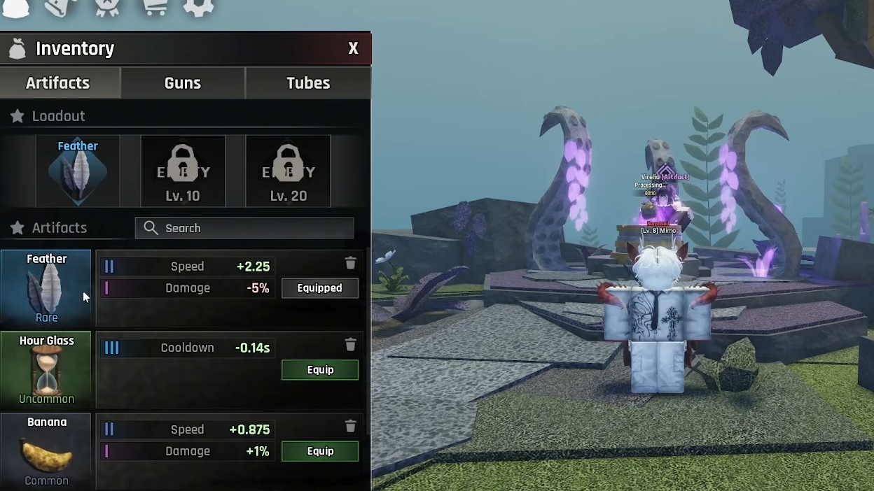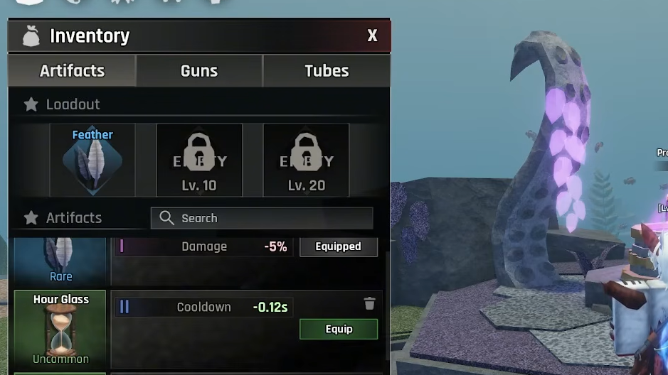 Artifacts apply their buffs on top of bonuses from guns, races, and other upgrades. Speed and cooldown Artifacts reduce fishing time per catch, while damage Artifacts increase the chance of catching rare fish. Oxygen Artifacts extend the time you can spend in deeper zones without resurfacing. Cash Artifacts multiply the money earned from selling fish.