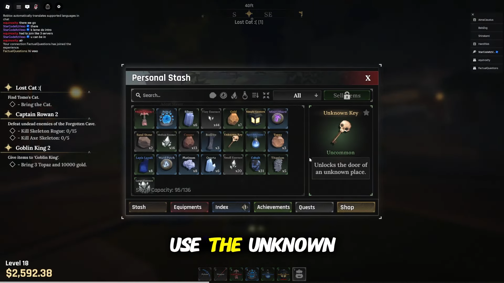 The Unknown Key has a single purpose – it unlocks the gate that blocks the entrance to the Fallen Angel’s Cave inside The Cave in Stonewake’s Cross. Once that gate is opened, you can reach the Arcane Pickaxe and buy it for in-game currency.