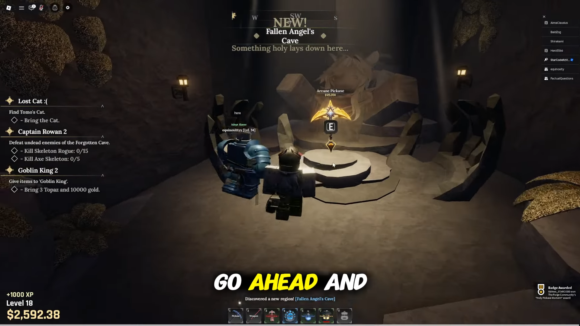 Inside the Fallen Angel’s Cave, the Arcane Pickaxe is suspended above a formation of stone hands at the far end of the chamber. Interacting with it opens a purchase prompt.