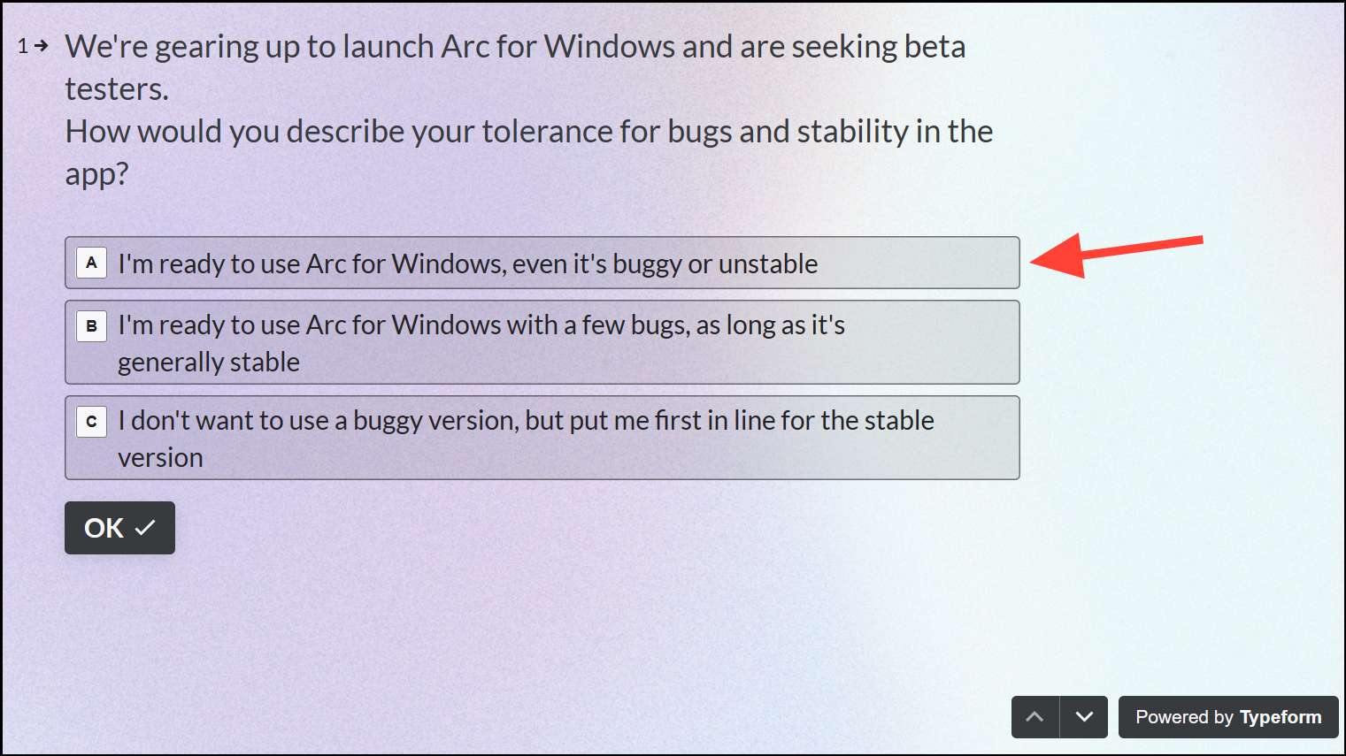 - Then, you'll need to answer a few questions. First, select how many bugs you can tolerate. To get access to Arc as soon as possible, select the first option, 'to get Arc for Windows now, even if it's buggy or unstable'.